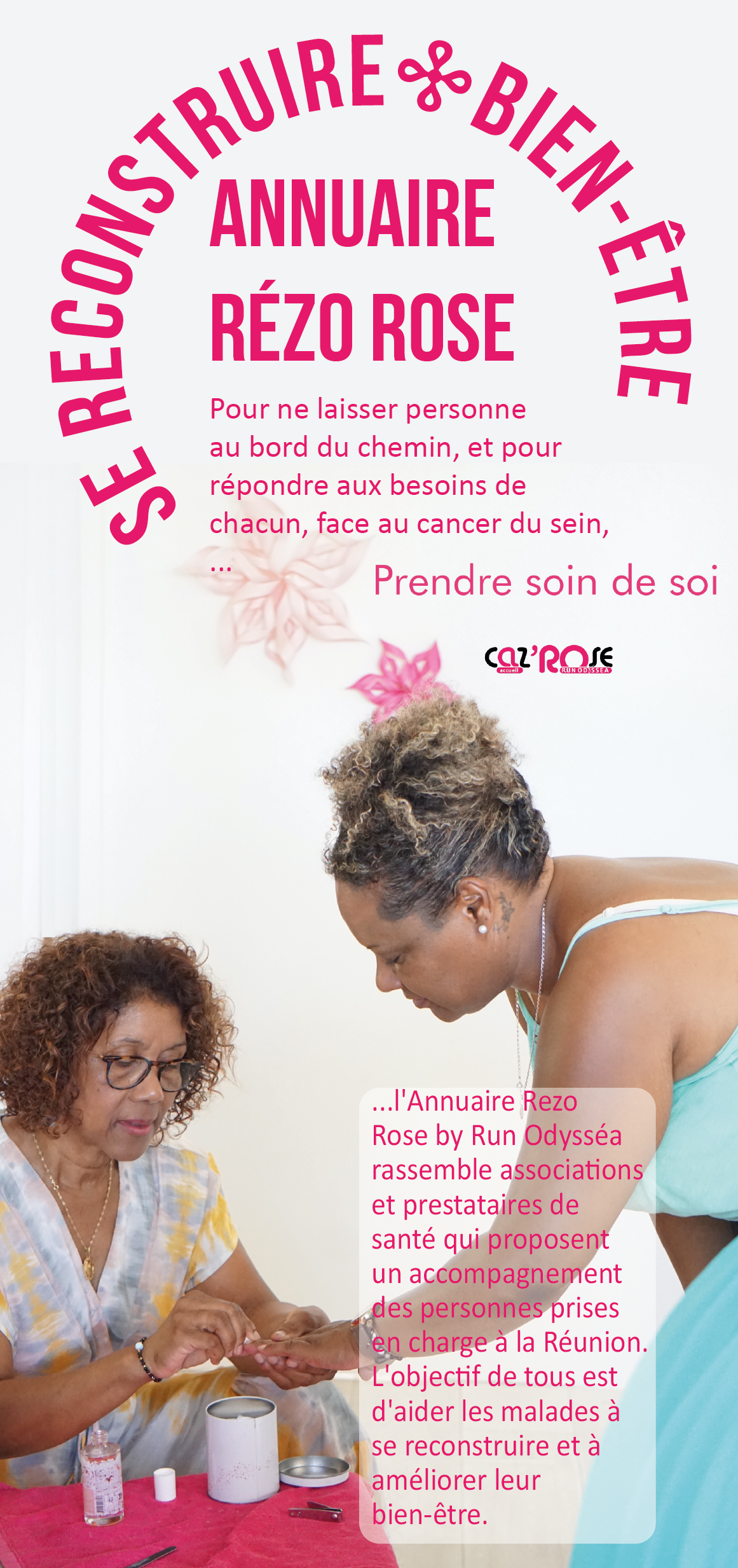 Les bénéficiaires peuvent également consulter l'Annuaire Rezo Rose (à télécharger ici) qui regroupe l'ensemble des prestataires offrant des soins de confort dans le cadre des dons Odysséa Réunion.