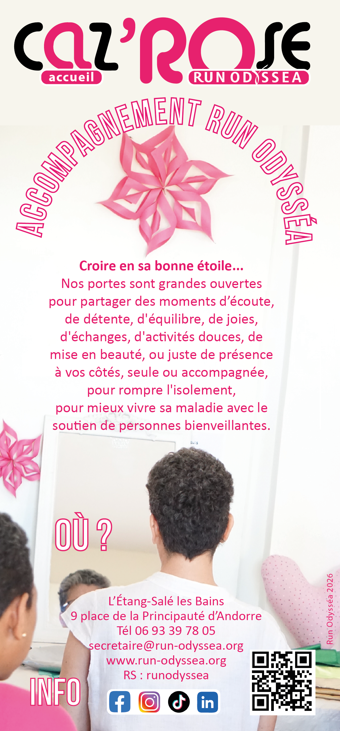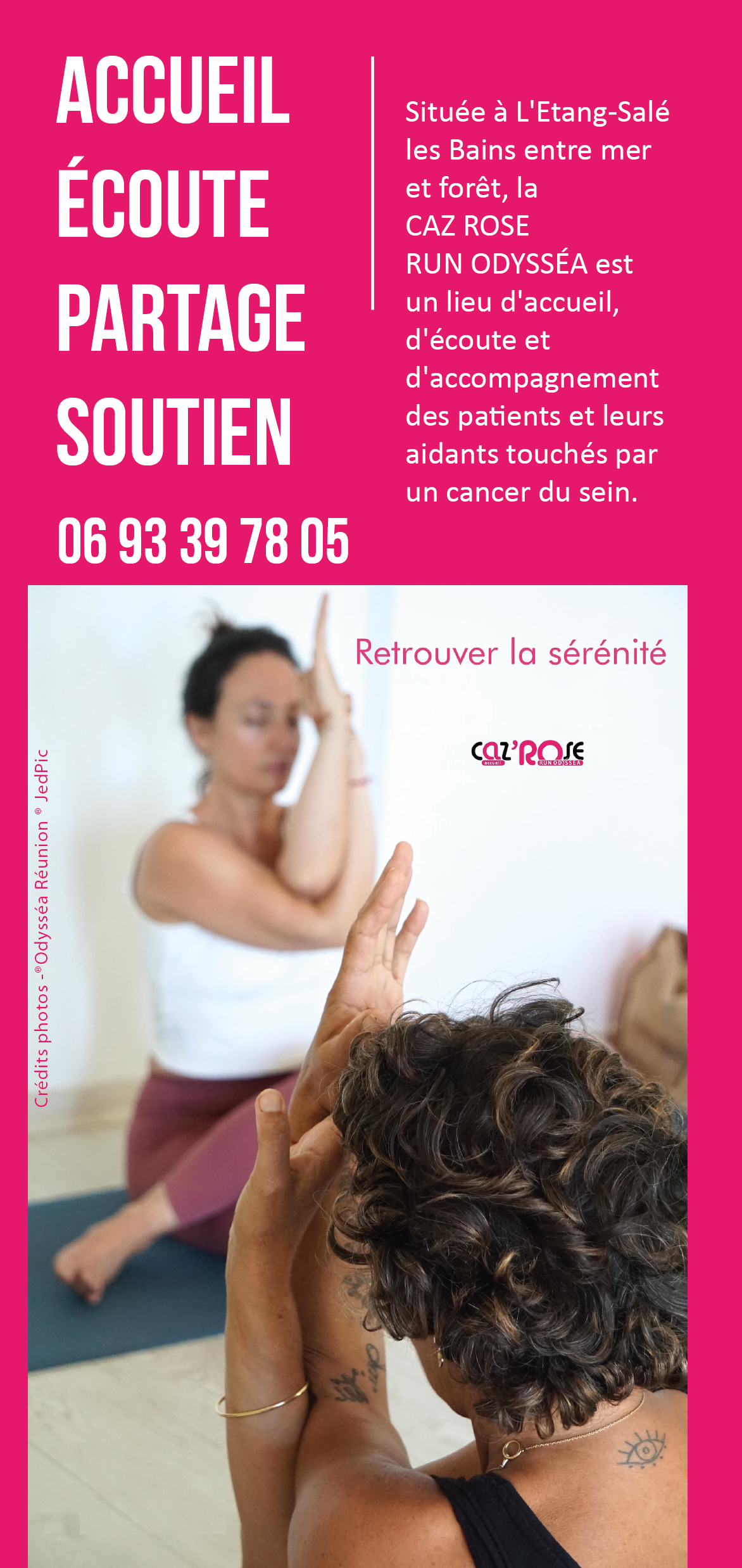 À l'Étang-Salé, la Caz'Rose (flyer à télécharger ici) accueille les patientes pour des ateliers de bien-être à la fois physique et moral. Accueillies par l'équipe de Run Odysséa, vous partagez des moments d'écoute privilégiée, de détente, d'équilibre, de joies, d'échanges, d'activités douces, de mise en beauté, ou juste une présence à vos côtés, seule ou accompagnée pour rompre l'isolement, pour mieux vivre sa maladie avec le soutien de personnes bienveillantes.